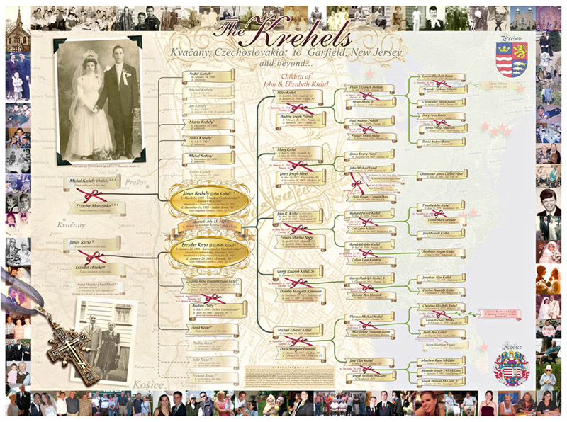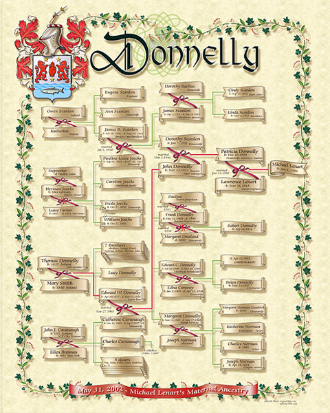 Our family trees are a collaborative process linking your research results with our design abilities. Each Trees by Design creation takes about three months from start to finish, but these times may be longer depending on the complexity of the design, our current workload, and your ability to provide the information needed to complete the artwork. Trees by Design creations make beautiful gifts for holidays, birthdays, weddings, anniversaries, religious ceremonies, family reunions, and just about any other occasion imaginable. NOTE: To see larger, more detailed images of the Donnelly and Krehel Family Trees shown on this page, click below to go to my Flickr web site. Then click on the thumbnail image, and click on "All Sizes" to see a full-sized, detailed view. |